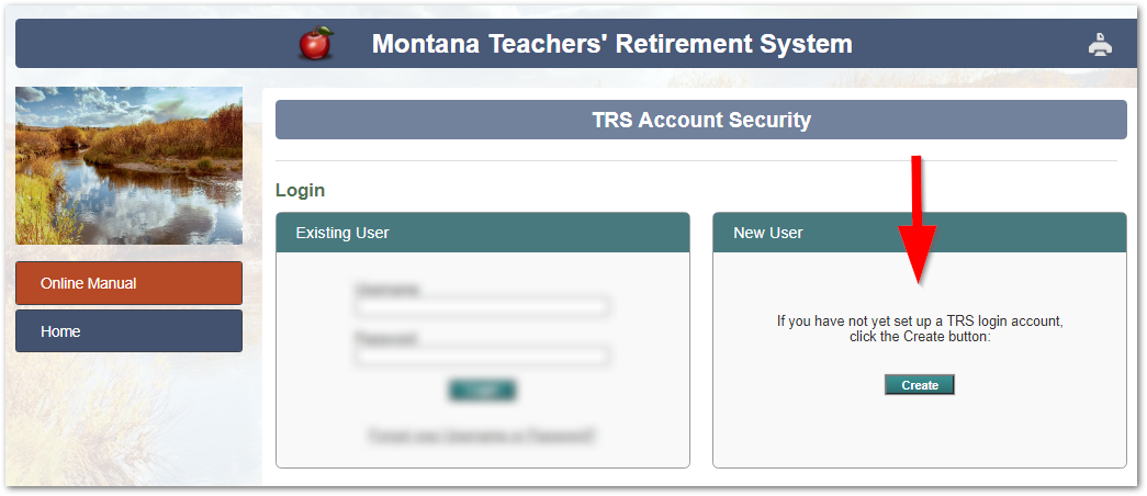 If you have never created a TRS user account: 1.Click the Create button on the right side of the TRS Account Security page: Image of TRS Account Security page - New User section