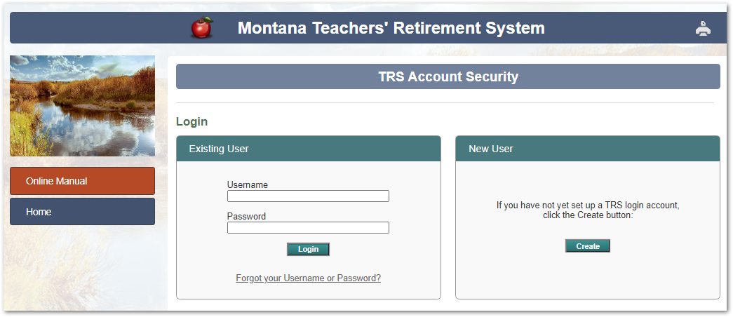 To log in with an existing account: Type your Username and Password in the Existing User section of the TRS Account Security page and click Login.